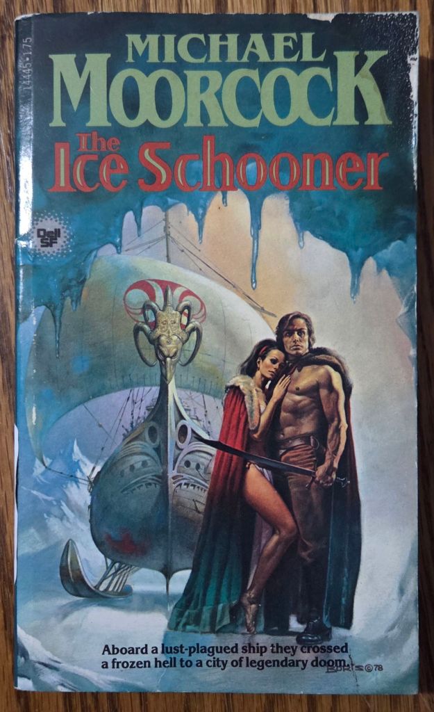 This was my first foray into one of the more obscure of Moorcock’s characters that is considered an aspect of the Eternal Champion. An interesting stage is set: a world covered in an impossibly long ice age, humanity adapting and struggling to survive, and a sinister fate awaiting all. Or so it seems. Considering I started reading this book during the height of winter and a particularly arctic few weeks, I felt myself drawn into the world even more. The people and society that were created in this book were very interesting. Generations living in a desolate frozen wasteland had developed sort of city-states that were burrowed into the ice, caverns dug into ice crevasses and descending to great depths of vertical living and community spaces. Only one major city is truly explored in the book, and includes familiar facilities like taverns and estates that make it feel very human and alive. The nature of travel has also evolved to mostly include humans on skis and also ships on skis. Hence the name of the novel. Major sustenance is found through hunting whale-like creatures that have evolved to roam over the ice. The economy is largely controlled by the city that can field the most ships, hunt the most whales. And that’s where our Champion comes in, Konrad Arflane.
